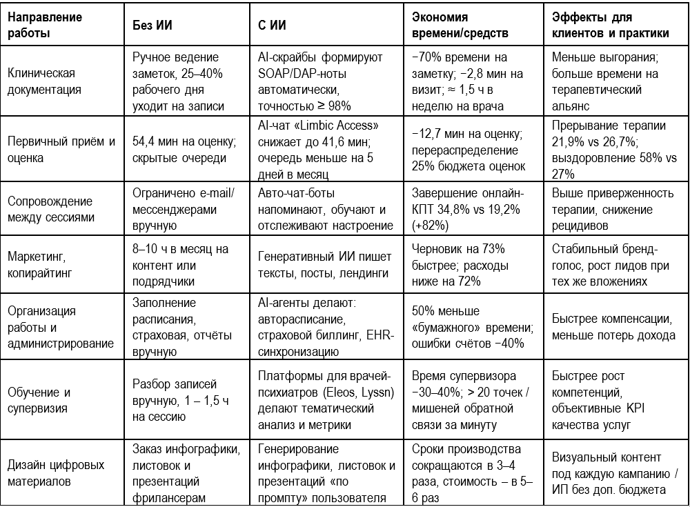 - 60-70% рутины — автоматизируется. Это не прогноз, а уже реальность для передовых практик. Речь о ведении документации (SOAP/DAP-ноты), первичном сборе анамнеза, администрировании, значительной части маркетинга. Представьте: 1.5 - 2 часа вашего рабочего дня возвращаются Вам! Чем их наполнить? Терапевтическим присутствием, супервизией, саморазвитием, наконец, личной жизнью.